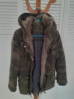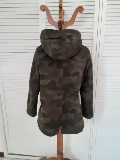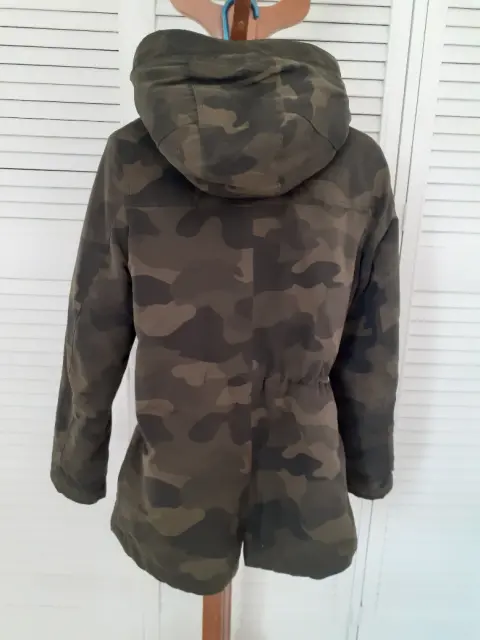 Chamarra militar H&M con gorro y frente forrada de Peluche, color verde militar con manchas, cómoda, calientita corte moderno hermoso, talla 6 combinable con todos los colores.