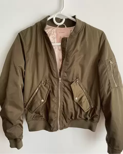 Chamarra tipo bomber, en un lado tiene una manchita que casi no se ve, aparte de eso está en buena condición, su talla es S.