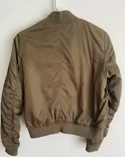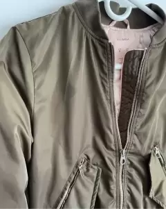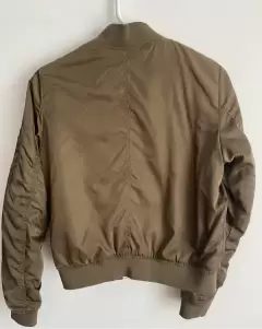 Chamarra mujer verde olivo. Chamarra tipo bomber, en un lado tiene una manchita que casi no se ve, aparte de eso está en buena condición, su talla es S.