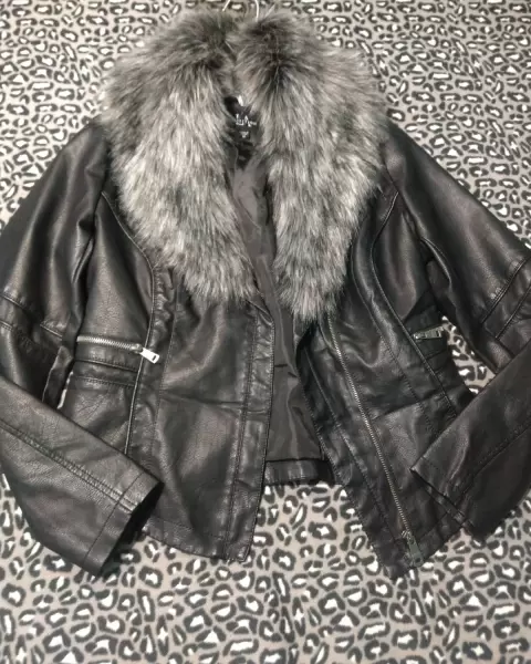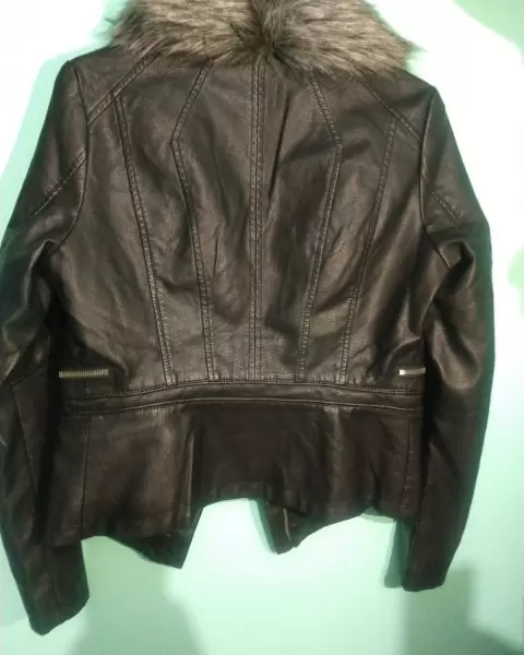 Chamarra negra de vinipiel con peluche en el cuello desmontable y dos bolsas con cierre en frente.