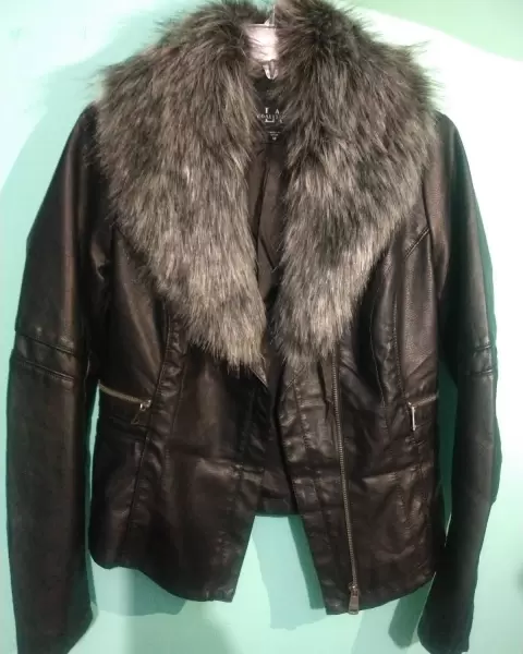 Chamarra negra. Chamarra negra de vinipiel con peluche en el cuello desmontable y dos bolsas con cierre en frente.