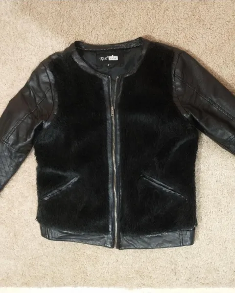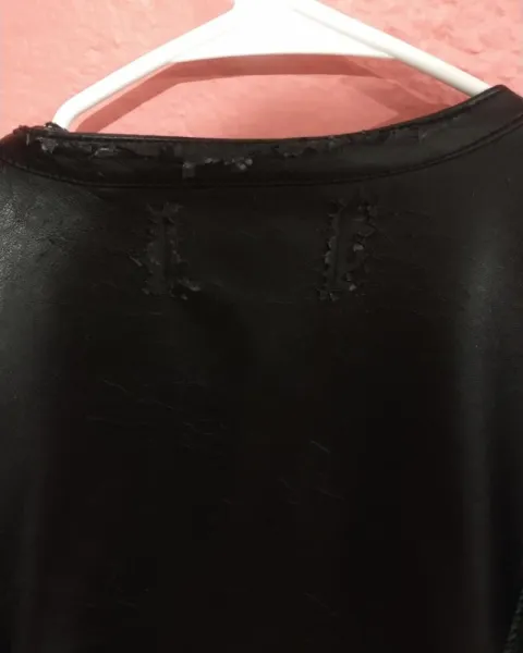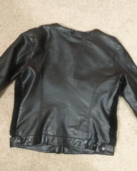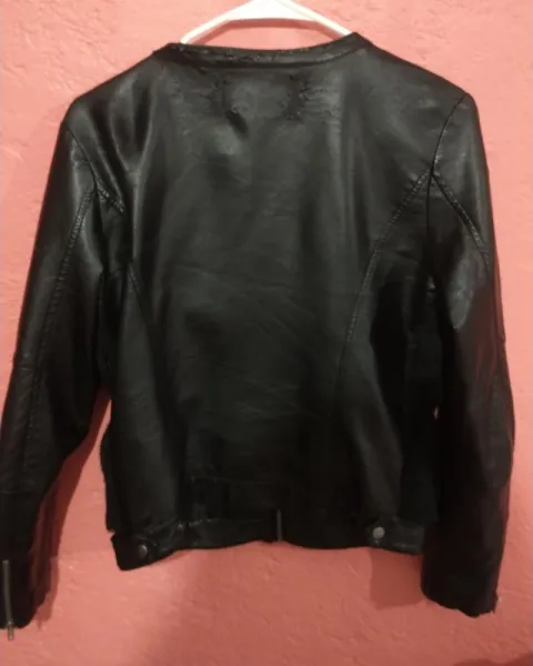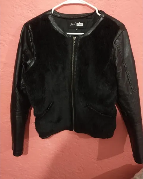 Chamarra negra de cuero con tipo piel en la parte parte frontal, talla mediana, marca infinit code. Tiene un detalle en la parte trasera, ya que se encuentra un poco rasgado.