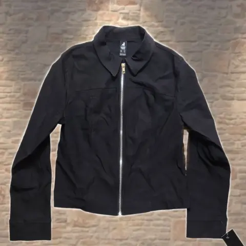 Chamarra negra, marca Cuidado con el perro, talla L, 70% viscosa, 25% poliamida y 5% elastano, estira. Es ligera y práctica para usar con outfits casuales y formales, completamente nueva.Hombro a hombro 37 cm.Axila a axila 44 cm.Largo total 52 cm.