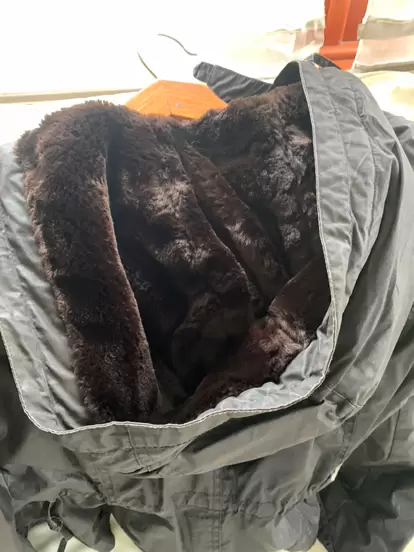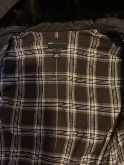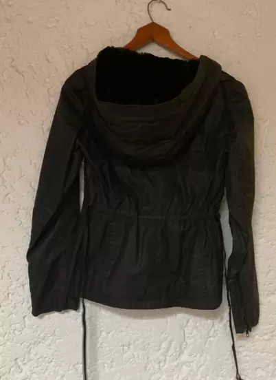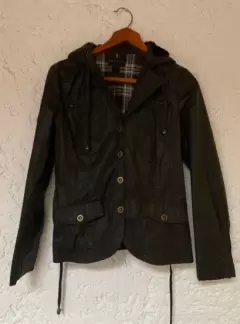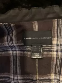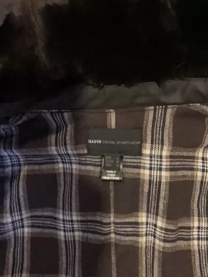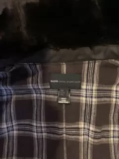 Chamarra café obscuro tipo cazadora marca mango forrada como gorro forro de peluche también café obscuro tela impermeable