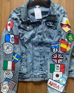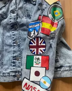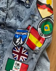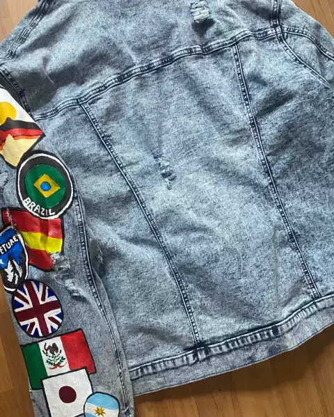 Chamarra de mezclilla pintada a mano unisex, ideal Para viajeros!!! , talla L queda a talla Xl Pregunta si tienes duda