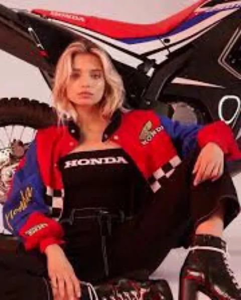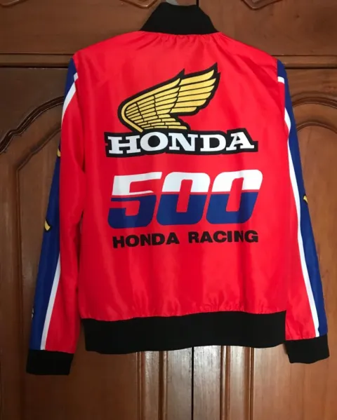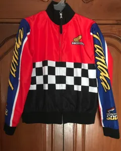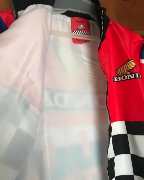 Chamarra rompe vientos estampado Honda, gruecesita fresca con forro por dentro y cierre frontal.