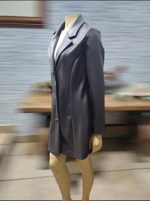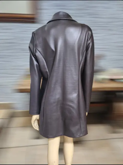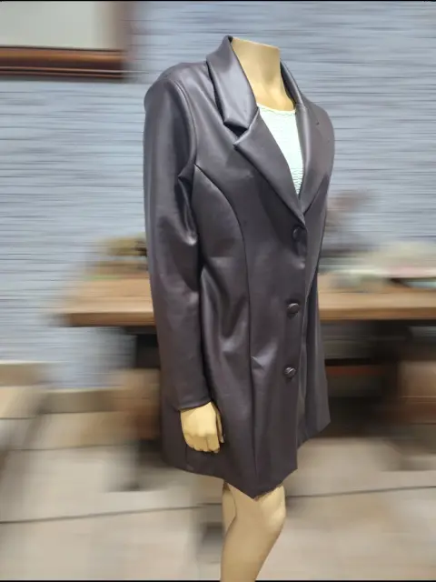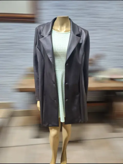 Chamarra rompevientos Larga colleccion Wearever, talla XL, color Cafe oscuro con tacto de pleader, habierta del frente con 3 botones. Cuello en V, Manga larga, acento de pliegue, tell Delgado hecha con polyester y espandex, cae a la rodilla, mide 42cm de hombro a hombro, 47cm de axila a axila 47cm de cintura, 59cm de Manga con 86cm de largo del hombro hacia abajo en buen estado cosmetico.