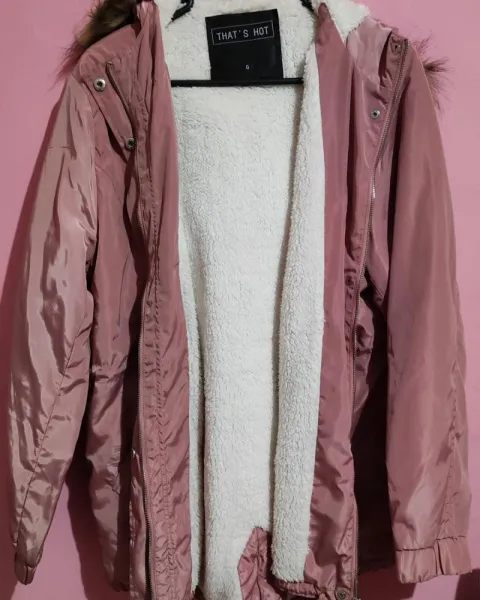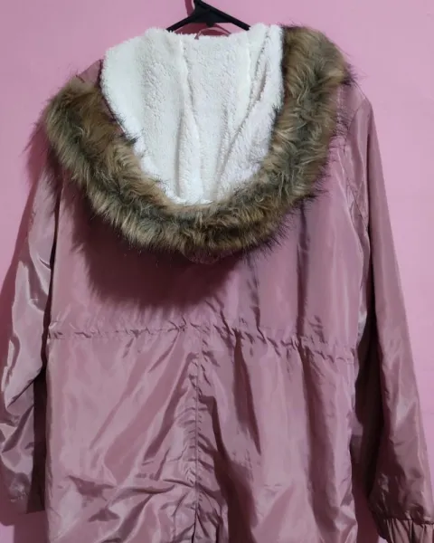 Chamarra talla grande en color rosa palo, por dentro es aborregada por fuera es de tela diferente y tiene un contraste muy padre. Solo la use una vez.