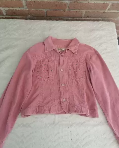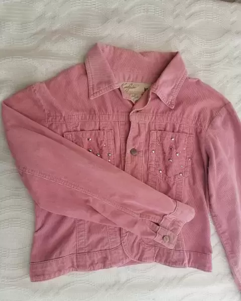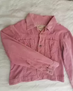 Chamarra tipo terciopelo. Chamarra juvenil de tela tipo terciopelo, con piedritas cocidas en las bolsas lo que le da un acabado muy lindo. Talla chica