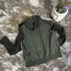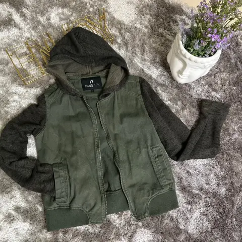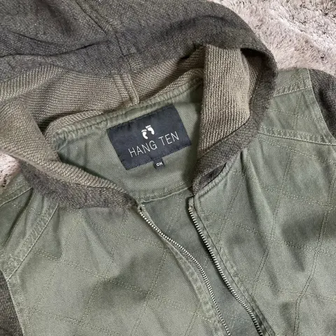 Chamarra verde militar con gorro, bolsillos al frente, tiene textura y las mangas son de tela distinta al cuerpo de la chamarra,