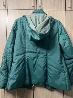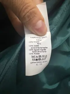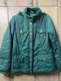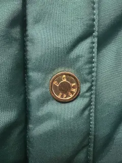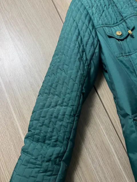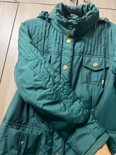 Chamarra verde PURIFICACIÓN GARCÍA de cierre y botines dorados, bolsas de boton, trae gorro y se puede guardar en un cierre que tiene escondido, es muy calientita.