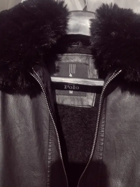 Chamarra vinipiel Marca Polo. Ofrezco chamarra negra marca Polo vinipiel con peluche desmontable en el cuello pequeño detalle en la manga. Ligeramente notorio. Talla Mediana..