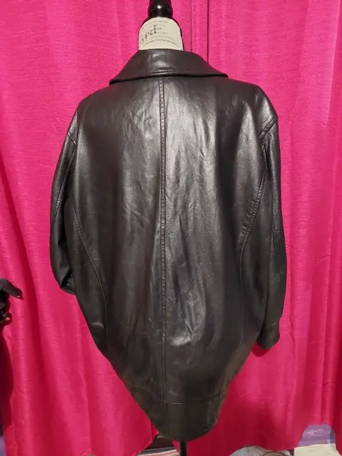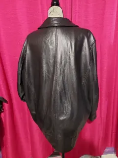 Auténtica piel muy suave y fina, tiene corte tipo motociclistas, no obstante, es larga, en foto medida, es talla XL a 1XL, pero es bombacha y angosta de cadera por lo que quedaría Oversize, está hermosa, manga larga, no tiene detalles, probablemente pintura,pero está intacta, siento que está en excelente estado. No está rota, rasgada, en las fotos se nota las medidas de axila y cadera.