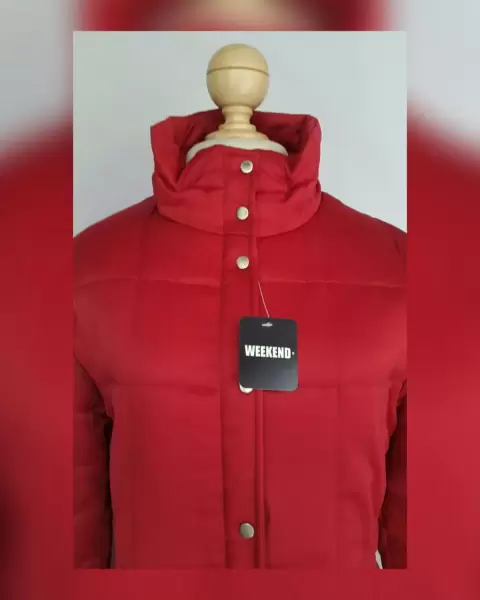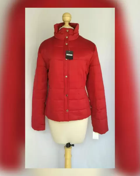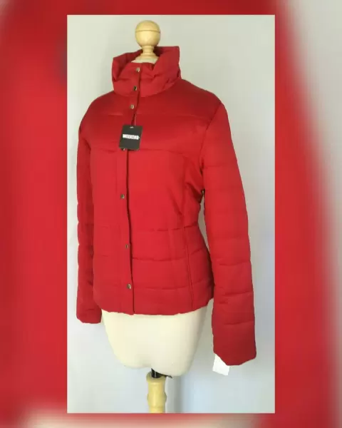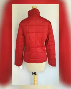 Chaqueta acolchada color ROJO QUEMADO, cuello Perkins, cierre p/cremallera oculta p/tapeta c/snaps, dos bolsos vivo frontales ocultos c/cremallera y forro interior. Talla EG. Dimensiones cms: 45 hombro, 61 axila, 53 cintura, 59 zona baja, 65 largo, 64 largo manga. 100% poliéster. Para lavado en casa.