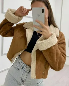 Chaqueta de Piel cafe con borrega. hermosa chamarra corta de piel autenticatalla grande pero viene reducido por lo cual queda desde una talla mediana. borrega autentica de forro en cuello y mangasya incluye tintoreria y tratado especial de pieles.