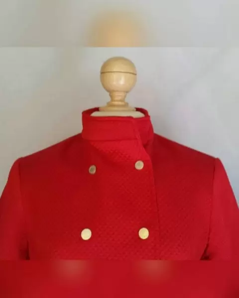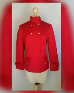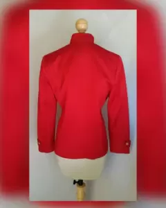 Chaqueta c/estructura color ROJO FUEGO, cuello Perkins, cierre p/doble snaps tono plata patinada, 2 bolsos vivo frontales c/tapeta y snaps, manga larga terminada en tira c/snaps y forro interior. Talla 32. Dimensiones cms: 40 hombro, 52 axila, 47.5 cintura, 56 zona baja, 67 largo, 60.5 largo manga. 74% algodón, 26% poliéster. P/limpieza en seco.***NUEVA, NUNCA SE HA USADO, SE LE CAYÓ LA ETIQUETA ESTANDO GUARDADA***EL TONO DE ROJO ES BELLÍSIMO, LAS FOTOGRAFÍAS NO LO CAPTAN***