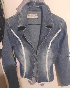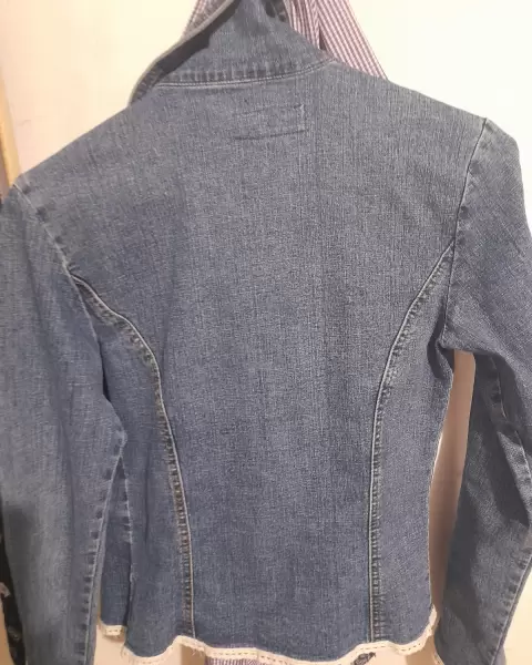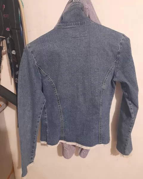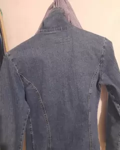 Hermosa chaqueta mezclilla muy ligera y con poco strech, mangas 3/4, pinzas en la parte de atras, con bies blanco x frente.Amolda super lindo