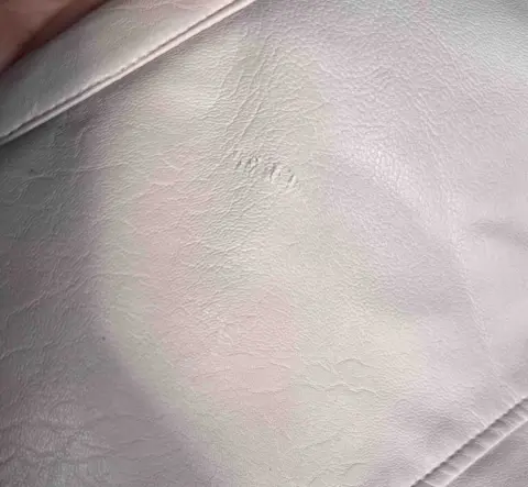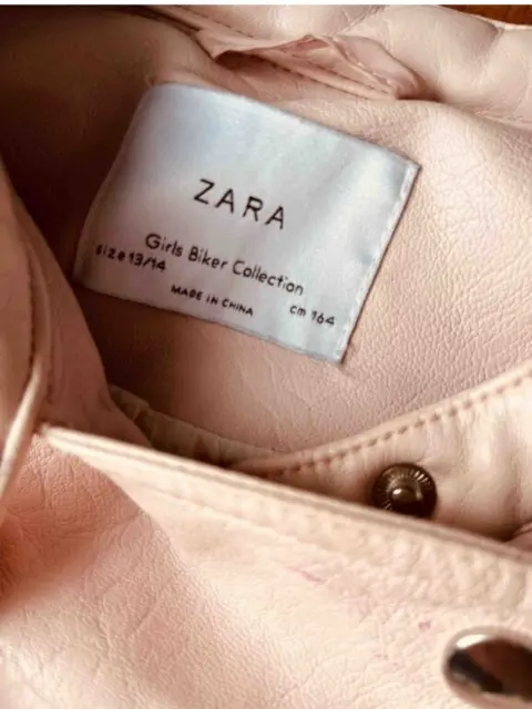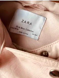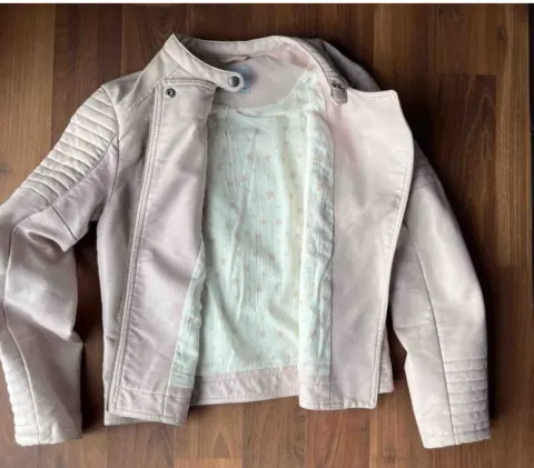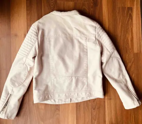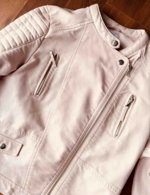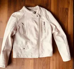 Preciosa chamarra imitación piel , es color rosa clarito. Talla 13/14 pero queda a talla XS mujer . Detalle en la parte de atrás pequeño desgaste no se percibe mucho ni afecta para nada su uso (ultima foto)