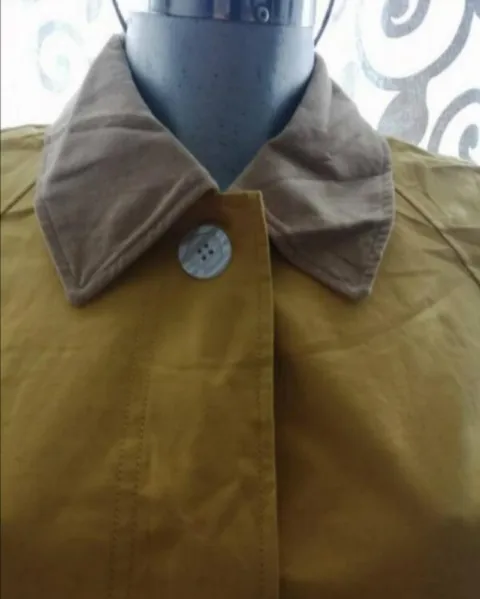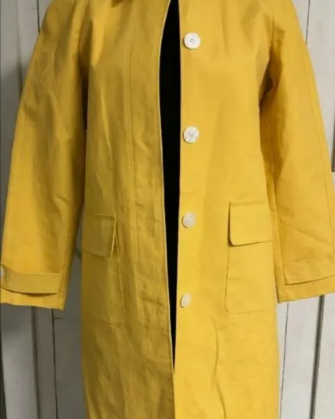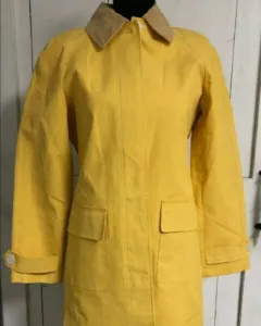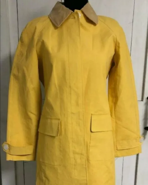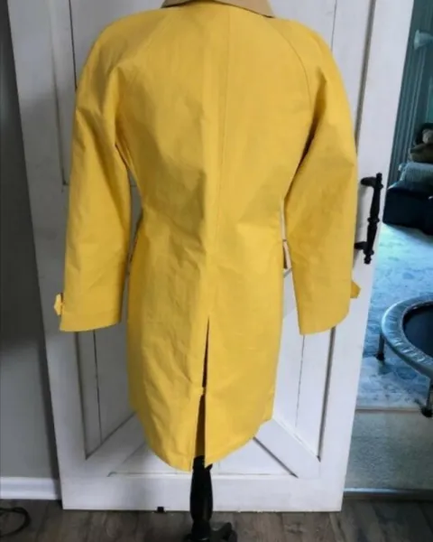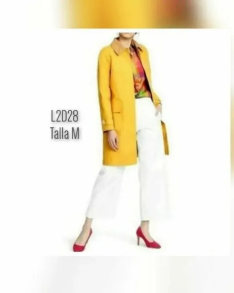 Hermosa gabardina amarilla larga, botones blancas, abertura trasera para mejorar la comodidad, bolsas delanteras, cuello de pana. Medidas largo 97.5cm, axila a axila 53cm, largo Manga 49cm