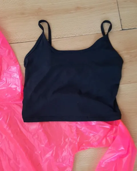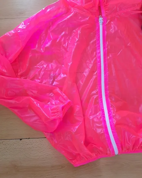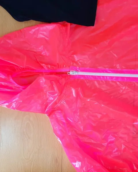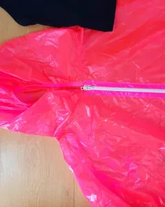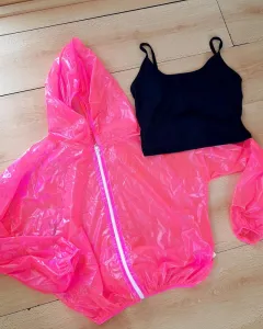 Impermeable rosa neon ideal para estas temporada de lluvia. Cierre al frente y viene con un top negro