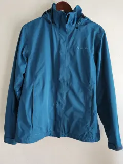 Impermeable VAUDE. Impermeable para senderismo azul luminoso, resistente al viento, transpirable. Chamarra ligera, moderna, la capucha se puede guardar en el cuello. Talla 40, strech