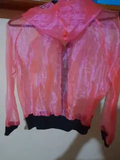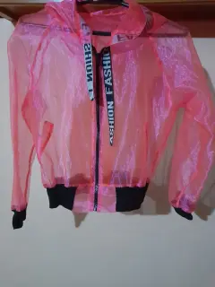 Linda chamarra transparente. Talla mediana, para jovencita, color rosa fluorescente, transparente, con gorro en la parte trasera, para uso casual.