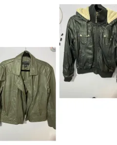 Pack de chamarras tipo piel. La chamarra negra no cuenta con detalles Chamarra gris cuenta con algunas cuarteaduras pero aún se puede usar fuera de eso no cuenta con más detalles prácticamente la gris la estoy obsequiando