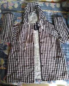 Rompevientos. Gabardina rompevientos para lluvia, con gorrito cuadriculado negro con blanco, bolsas al frente