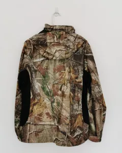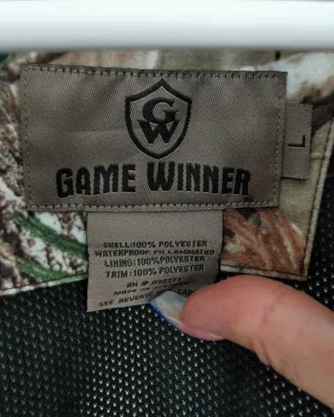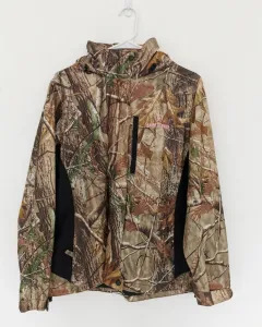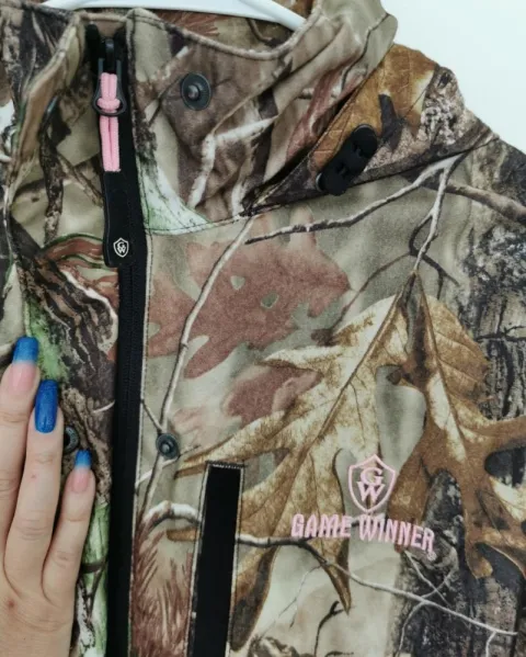 Rompevientos con capucha de tela camuflajeada y café. Forro de malla. Cuello alto. La capucha se puede guardar en el cuello. Siper cubierto con solapa con botones. Los puños de las mangas tienen velcro para ajustar. Bolsillos de jareta con siper para meter las manos y uno mas en la parte superior derecha. Jareta con cintas en la cintura para ajustar. Símbolos Game Winner y jaladera del siper en color rosa. Talla L.
