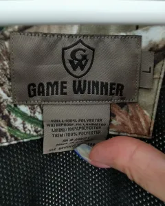 Rompevientos camuflajeado Game Winner. Rompevientos con capucha de tela camuflajeada y café. Forro de malla. Cuello alto. La capucha se puede guardar en el cuello. Siper cubierto con solapa con botones. Los puños de las mangas tienen velcro para ajustar. Bolsillos de jareta con siper para meter las manos y uno mas en la parte superior derecha. Jareta con cintas en la cintura para ajustar. Símbolos Game Winner y jaladera del siper en color rosa. Talla L.