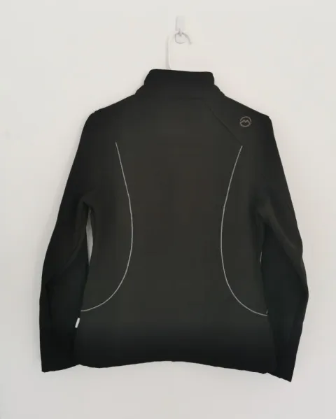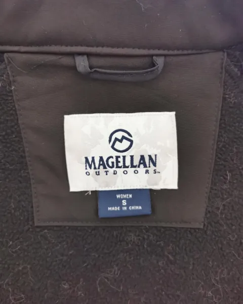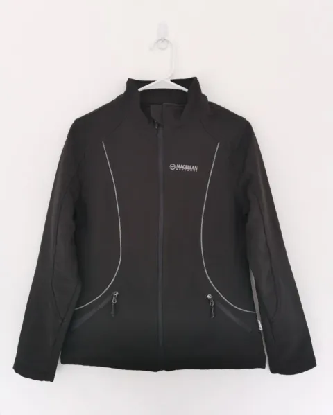 Rompevientos negro Magellan. Rompevientos de tela tipo loneta. Cuello alto. Bolsillos de jareta con siper al enfrente para meter las manos. El siper principal está expuesto. Cortes circulares al frente y en la espalda para dar forma a la cintura. Talla S