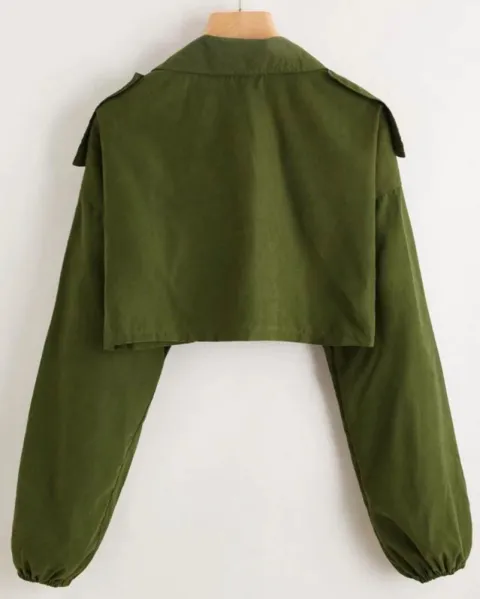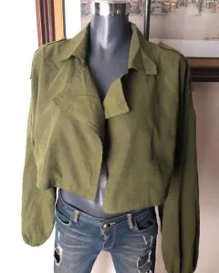 Torera verde. Chaqueta o sobre camisa. NO es chamarra, es más bien para cubrir poco, como accesorio ya que es muy muy delgada. Es talla xl, en cuanto a largo viene corta puede que llegue solo hasta debajo del busto. Medidas: Hombro 67cm. Pecho 112cm. Largo 40cm.Puede que le quede bien a una talla M, pero si poco aguada.