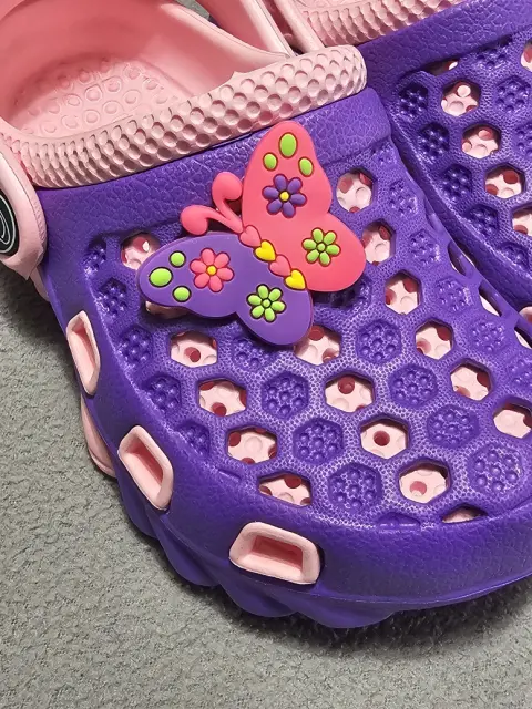 CHANCLAS DE NIÑA MARIPOSA. Hermosas sandalias de suela EVA ultra cómodas y suaves en color morado y rosa con detalle de mariposas 🦋.Tamaño: 14 cm de suela.