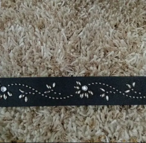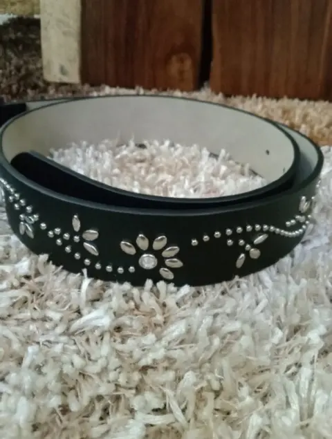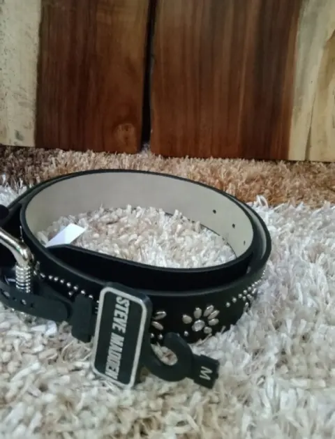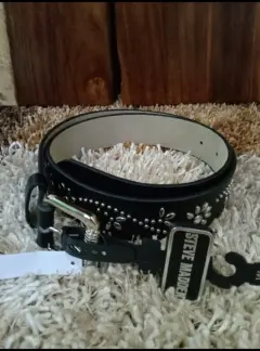Bonito cinto. Cinturón Steve Madden color negro con aplicaciones en niquel color plateado formando una flor.Hebilla en niquel color plata.Talla M.Material sintético y reciclado.