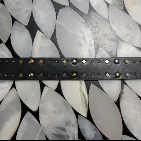 Cinturón color negro con aplicaciones en niquel color bronce, plateado y dorado. Hebilla y logo de la marca en niquel color plateado.Talla MMaterial sintético y reciclado.