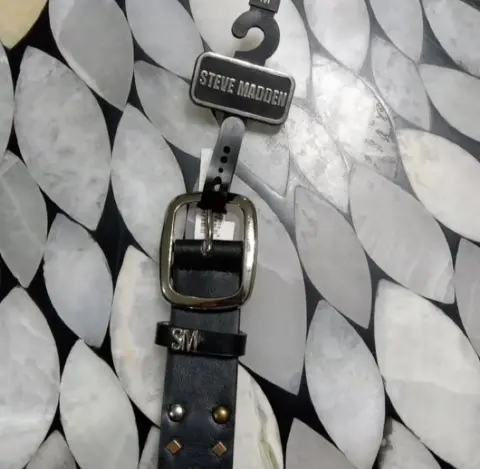Cinto Steve Madden. Cinturón color negro con aplicaciones en niquel color bronce, plateado y dorado. Hebilla y logo de la marca en niquel color plateado.Talla MMaterial sintético y reciclado.