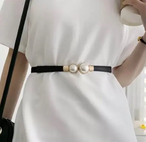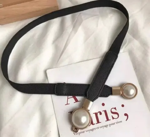 Cinturón con perlas. Cinturón elástico color negro con hebilla de perla Unitalla nuevo medidas : 1.5 cm de ancho y 65cm largo
