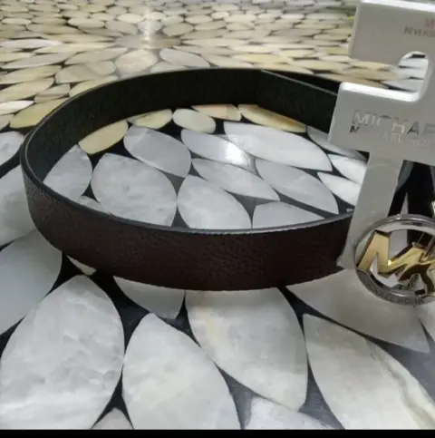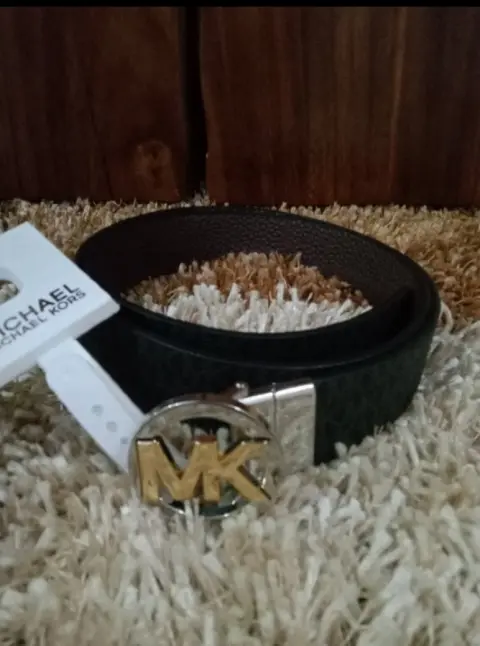 Cinturón MICHAEL KORS. Cinturón doble vista en color negro con estampado del logo de la marca y del otro lado color café. Texturizado.Hebilla con el logo de la marca en niquel color plateado con dorado.Talla MMaterial: cuero