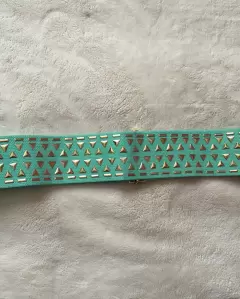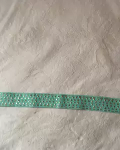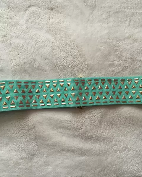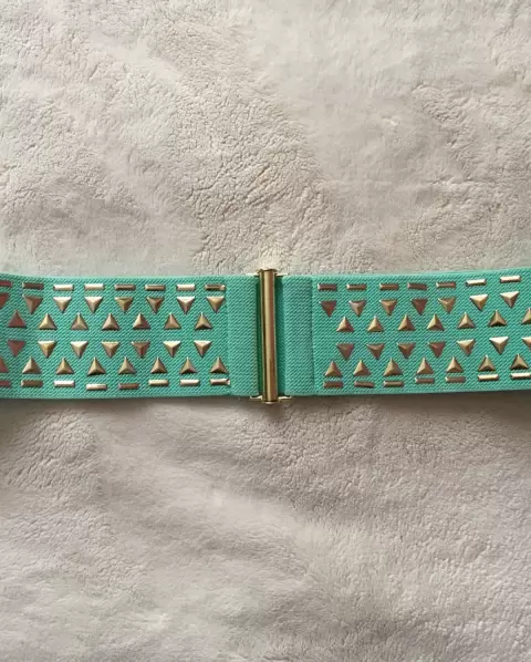Cinturón elástico verde agua con aplicaciones doradas. La tela es elástica y acentúa la cintura. Entre talla ch y m. El broche súper práctico. Tiene 83 cm de largo.