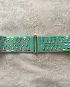 Cinturón verde aqua con dorado. Cinturón elástico verde agua con aplicaciones doradas. La tela es elástica y acentúa la cintura. Entre talla ch y m. El broche súper práctico. Tiene 83 cm de largo.