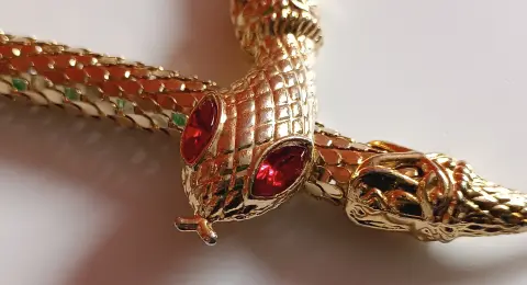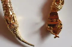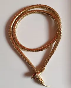 Cinturón de serpiente con escamas de mesh en tono dorado marca DL Auld. Vintage de los años 80, ojos de pedrería color vino. Estos cinturones únicos son muy codiciados y coleccionables. Está en excelentes condiciones y mide aproximadamente 87.5cm excluyendo la cabeza y la cola. Yo diría que la talla es pequeña, pero podría usarse en una XS, S y posiblemente una M,es ajustable.