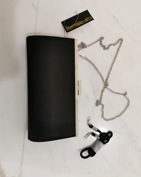 Bolsa de gala Sasha. Bolsa de noche nueva. De tela tipo raso drapeado y pedrería plateada. Por atras solo es de tela. Con cadena y cordón, ambos desmontables, para llevarla al hombro. 24 cm de largo, 13 cm de alto y 5 cm de ancho cerrada. Bolsillo interior de parche en un costado.