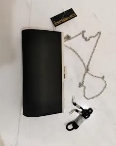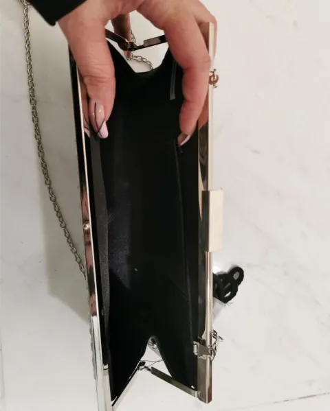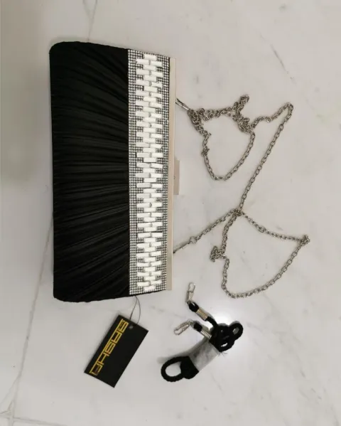 Bolsa de noche nueva. De tela tipo raso drapeado y pedrería plateada. Por atras solo es de tela. Con cadena y cordón, ambos desmontables, para llevarla al hombro. 24 cm de largo, 13 cm de alto y 5 cm de ancho cerrada. Bolsillo interior de parche en un costado.