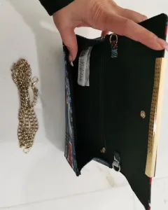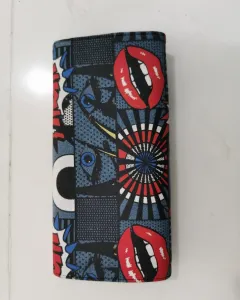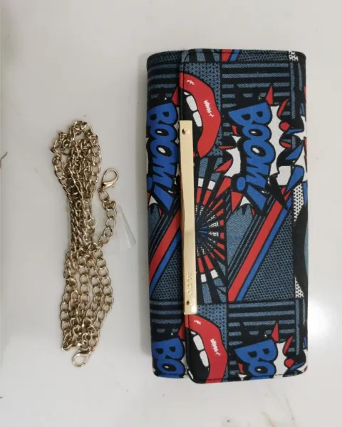 Bolsa nueva. de mano con diseño de comics. En colores azul, negro y rojo. Con cadena dorada. desmontable para llevarla al hombro. 21 cm de largo, 12 cm de alto y 4 cm de ancho cerrada. Bolsillo interior de jareta con siper en uno de los costados y compartimentos para tarjetas.