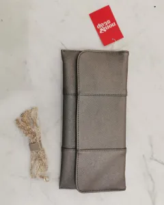 Bolsa de mano Nueva. Acabado imitación piel, color gris, lila. Con cadena dorada desmontable para llevarla al hombro. 30.5 cm de largo, 14.5 cm de alto y 1.5 cm de ancho cerrada. Bolsillos interiores, uno de jareta con siper en un costado y otro de parche en el otro.