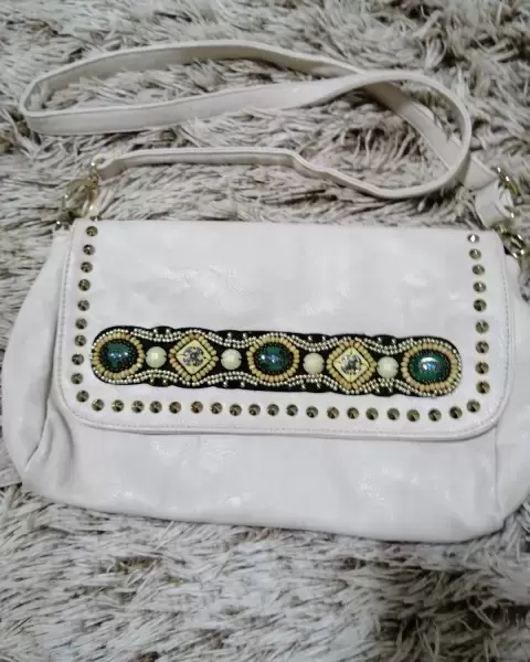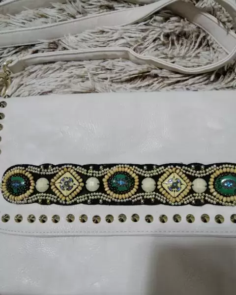 Bolsa de piel. Esta divina es de piel con aplicaciones hermosas está impecable sin defectos solo una pequeña mancha en la parte de adentro como lo muestro en fotos las astas se desmonta para usarla como carte de fiestaMedidas de ancho 33 CM de alto 20 CM