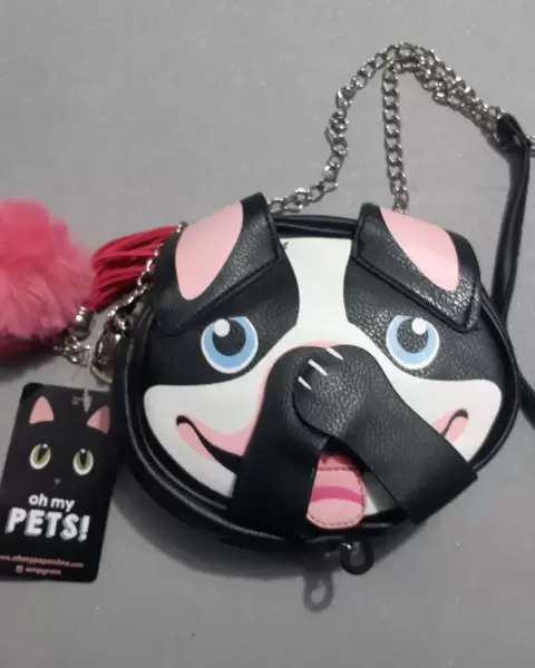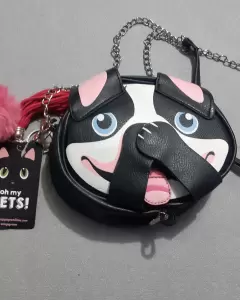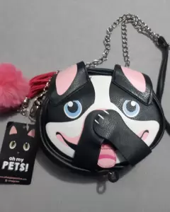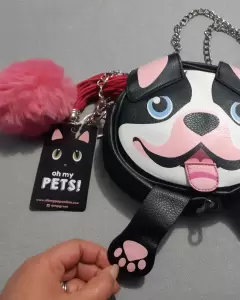 Bolsa oh my pop! Bulldog. Bolso con la forma de un perrito tímido. Sus medidas son: 18 x 15 x 7 cm y con una cadena para llevar al hombro de 110 cm. Tiene orejas, un pompóm rosita y un cascabel que suena. La marca es Oh my pop! que tiene además unas patitas en 3D