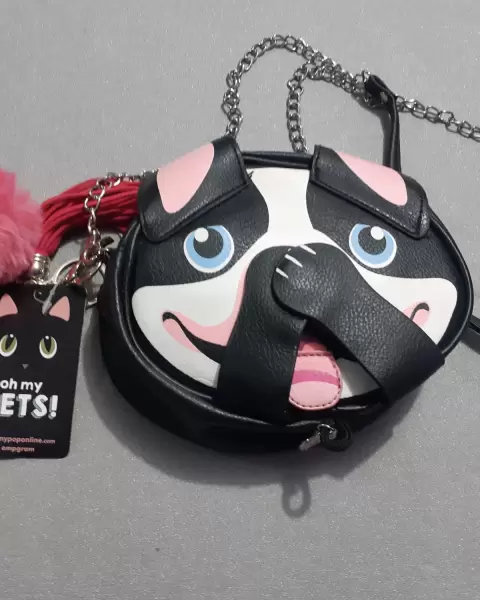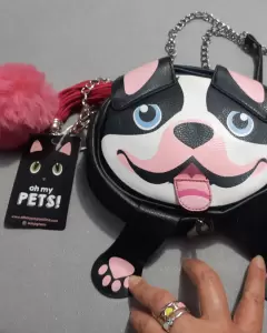 Bolso con la forma de un perrito tímido. Sus medidas son: 18 x 15 x 7 cm y con una cadena para llevar al hombro de 110 cm. Tiene orejas, un pompóm rosita y un cascabel que suena. La marca es Oh my pop! que tiene además unas patitas en 3D