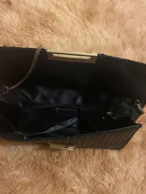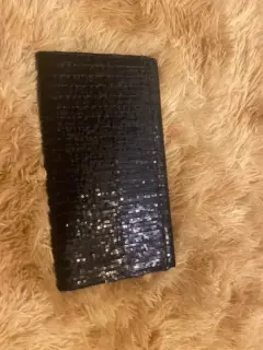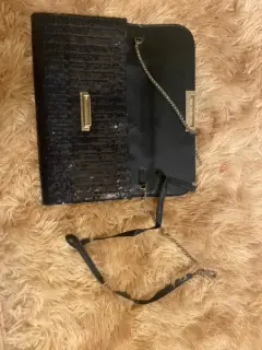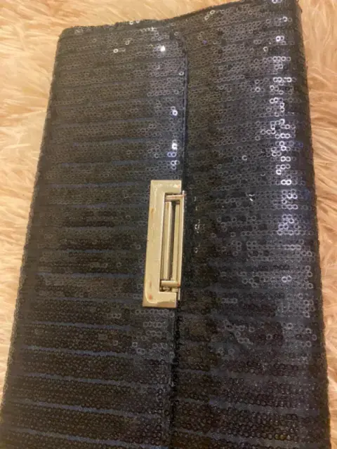 Cartera para fiesta con lentejuelas color azul marino, con correa para colgarse en buen estado detalle que no afecta en el cierre