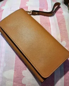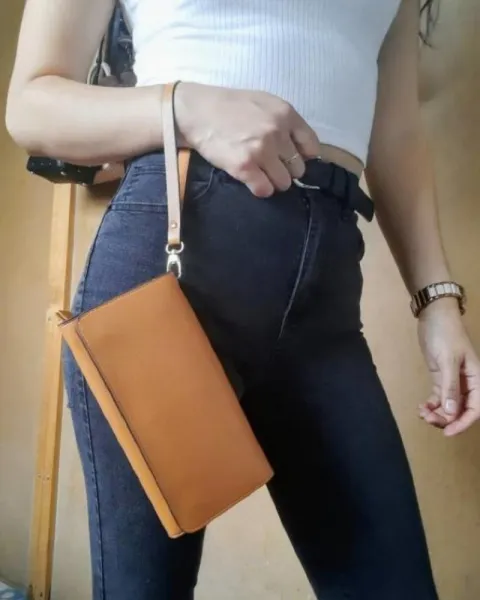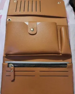 Cartera con asa, diseño sencillo pero elegante, color camel, con aberturas para billetes, monedas, tarjetas, celular y un labial. Se divide en tres y se compacta. Medidas: 21 x 11 cm (aproximadamente).Meterial: Piel sintética.Super práctica y bonita para cualquier tipo de ocasión. ❤️*No incluye el dinero ni las tarjetas*